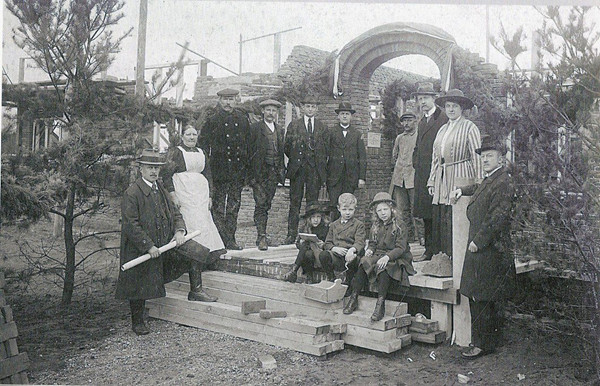Huis “Laag Wolfheze ” in aanbouw. Links de landschapsarchitect Samuel Voorhoeve die het tuinontwerp uitvoerde. Geheel rechts de architect van het huis Samuel de Clercq. Verder leden van het gezin Van Eeghen, de aannemer en werknemers van de laatste.