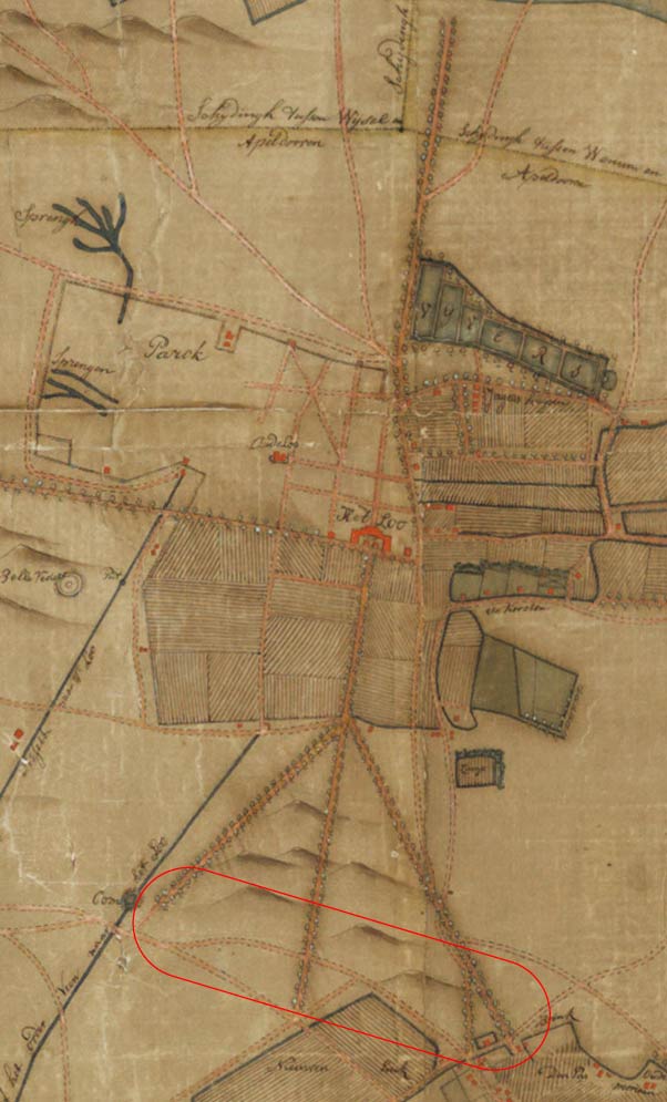 Uitsnede Caart der Limitten van de Hooge en Vrije Heerlijckhijdt van Het Loo (1748-1762), W. Leenen (Bron: Paleis Het Loo). De cirkel geeft ruwweg het terreindeel weer waar het bewaarde ontwerpdeel betrekking op heeft.