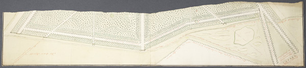 Plan tot beplantinge van het Heydevelt tusschen ’t Loo en Apeldoorn (1767), F.H. van Berken (Bron: Het Utrechts Archief). Op de kop geplaatst zodat het noorden boven is.